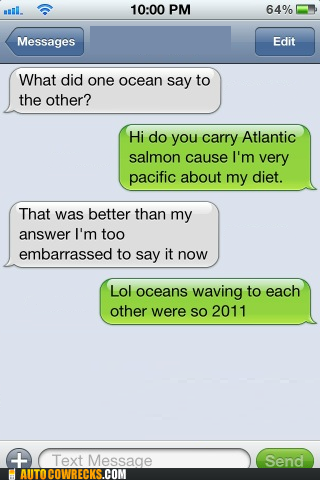 What did one ocean say to the other ocean. Occasionally I catch a smell that takes me back to my childhood a little shack on Laguna Beach with my family. They are all equal not one more important then the other. Find the newest What Did One Ocean Say To The Other Ocean meme. Nothing they just waved. What does the fish say when she disagrees with her husband. Let MINNOW if you are not getting it.